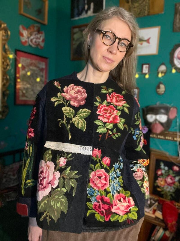 Giacca completamente ricamata a mano con inserti di stoffa in pura lana. Due tasche laterali. Chiusura con bottoni a pressione. Taglia unica, oversize. Veste da M-XL